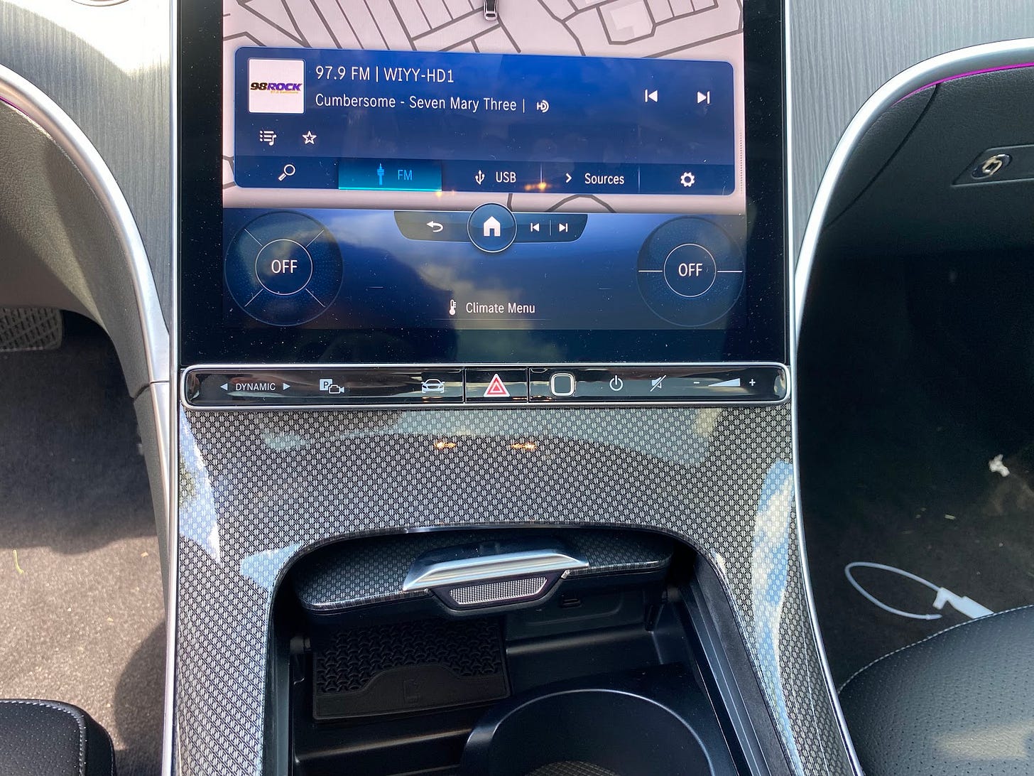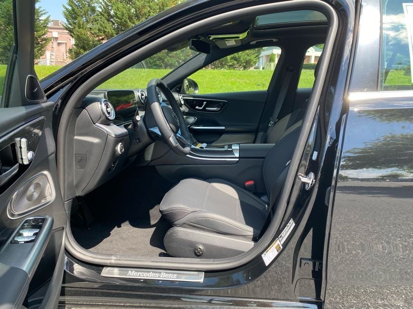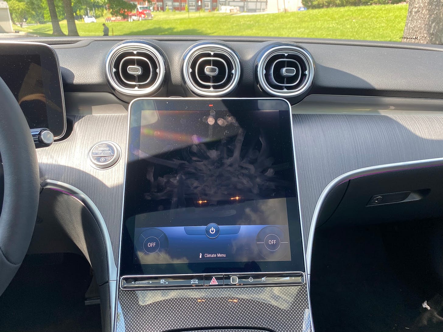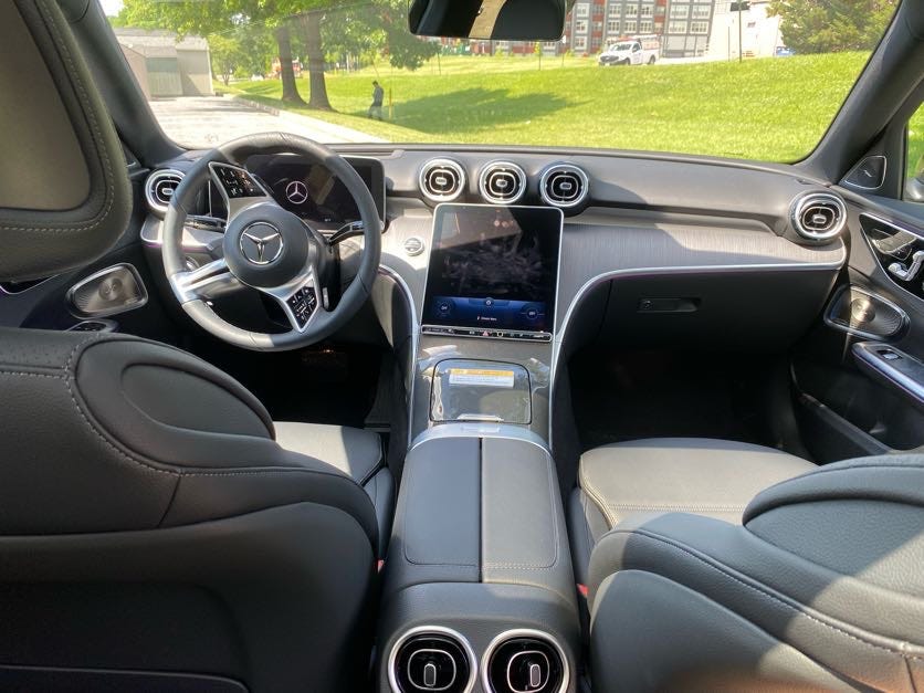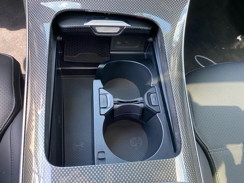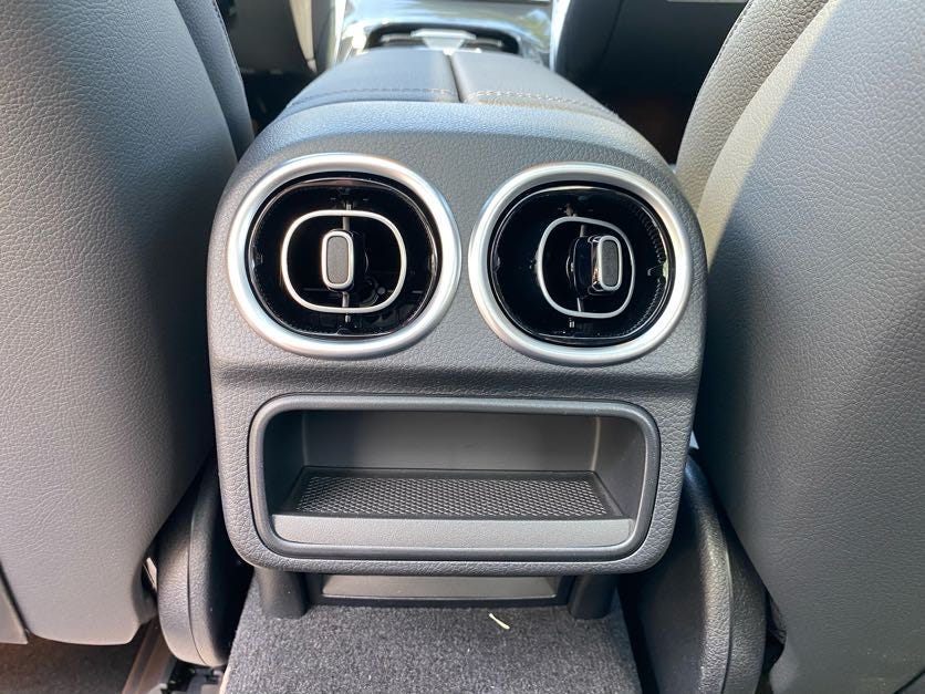 The rest of the interior is a pretty standard Mercedes. Clean fit and finish, classy materials, soft-touch buttons on the steering wheel, and exquisite leather as far as the eye can see. I am less of a "faux-carbon" guy, so that could be my only major complaint up front, but at that point, I'm nitpicking. The soft-touch that I mentioned earlier will take some getting used to. There is no physical click when you press something to move it, only a slight bit of movement before whatever you pressed starts to affect your surroundings. It is most noticeable on the seat controls, where I had some mild difficulty setting my seat. That being said, considering how other manufacturers are also switching to soft-touch controls, I am pretty confident that we as humans will get used to it fairly quickly. Rear seat legroom also isn't an issue, with it being tall people friendly, and available with two USB-C ports under the air vents.