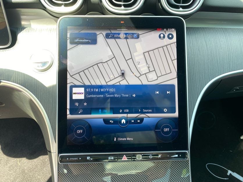The C300 drives as well as you would expect a Mercedes to drive. On bumpy i-795, the car felt smooth and silky, gliding over bumps without much disturbance in the cabin nor excess noise. As stated earlier, the automatic volume changing for the radio minimizes the road noise even more and makes sending voicemails easy peasy. In eco mode, the mild-hybrid 4cyl still has some get-up-and-go while also providing a much better average fuel economy while driving, one that is similar to a smaller car. In sport mode, the C-Class wants to be an AMG so badly. The exhaust gets louder, the handling gets sharper and the digital screen turns red. It is an enjoyable drive, sporting just as much performance and poise as the 3 Series while riding better than anything the Bavarians could ever put together.