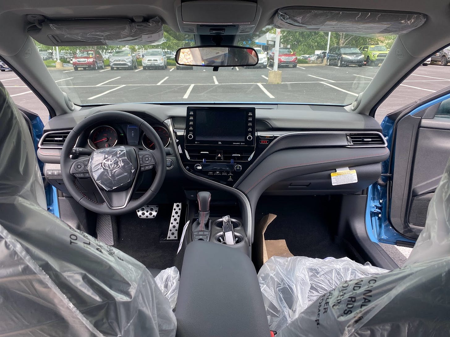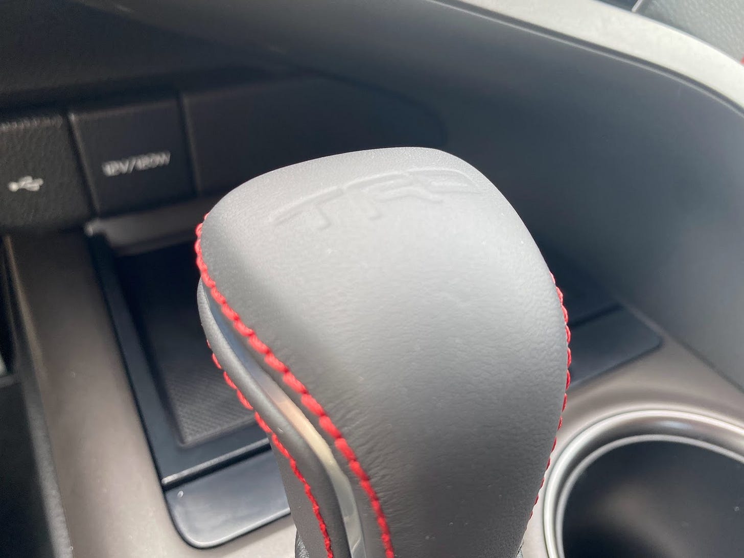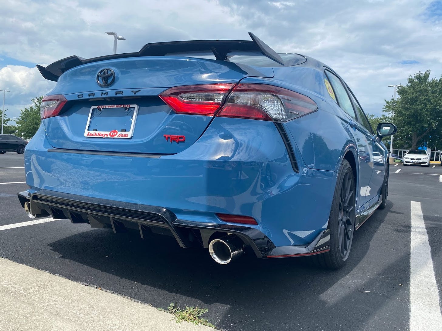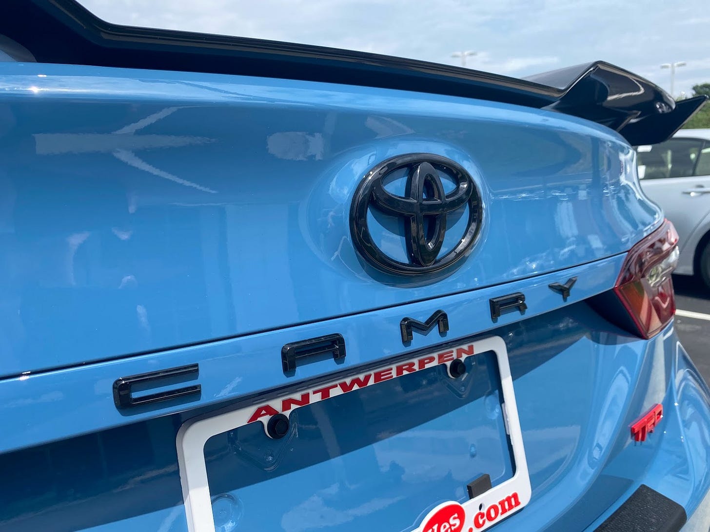 Let’s start on the outside. The single most obvious part of the TRD Camry is the gloss black rear spoiler. While it looks large in pictures, in reality, it’s no larger than that of an Elantra R. Accompanying the black spoiler are a set of black TRD rims, black round body trim including a front and rear splitter as well as side skirts, and a black roof that is part of the two-tone paint scheme on every TRD Camry. This particular model comes in Cavalry Blue, which again, looks suspiciously similar to the Hyundai N blue. Regardless, it still looks great even with the red accents that appear on various spots around the car. In short, it looks like a Camry went through a Forza Horizon 5 upgrade bin. I love it. There is no need for the TRD to look like this, and yet I couldn’t be happier that it does.