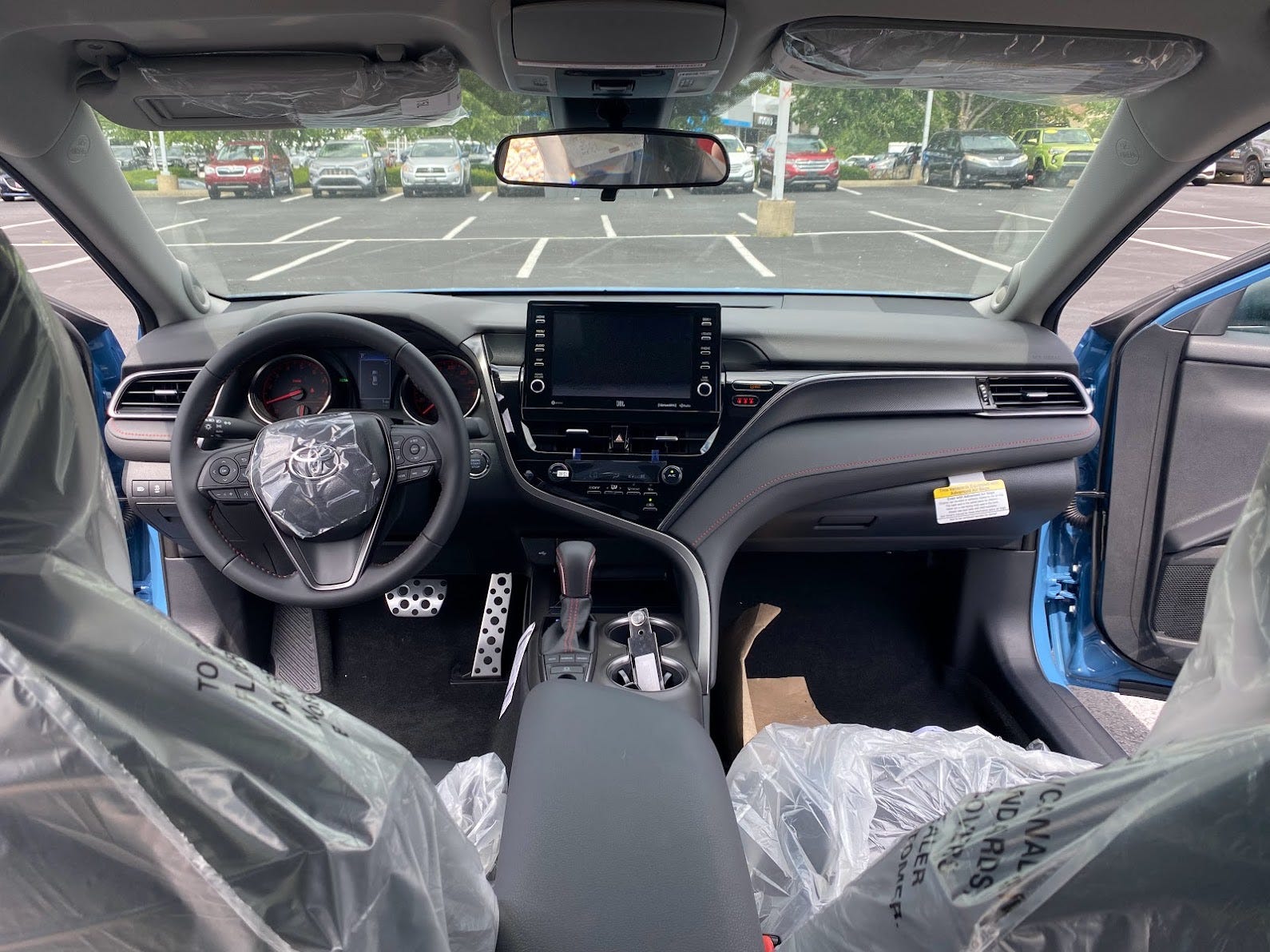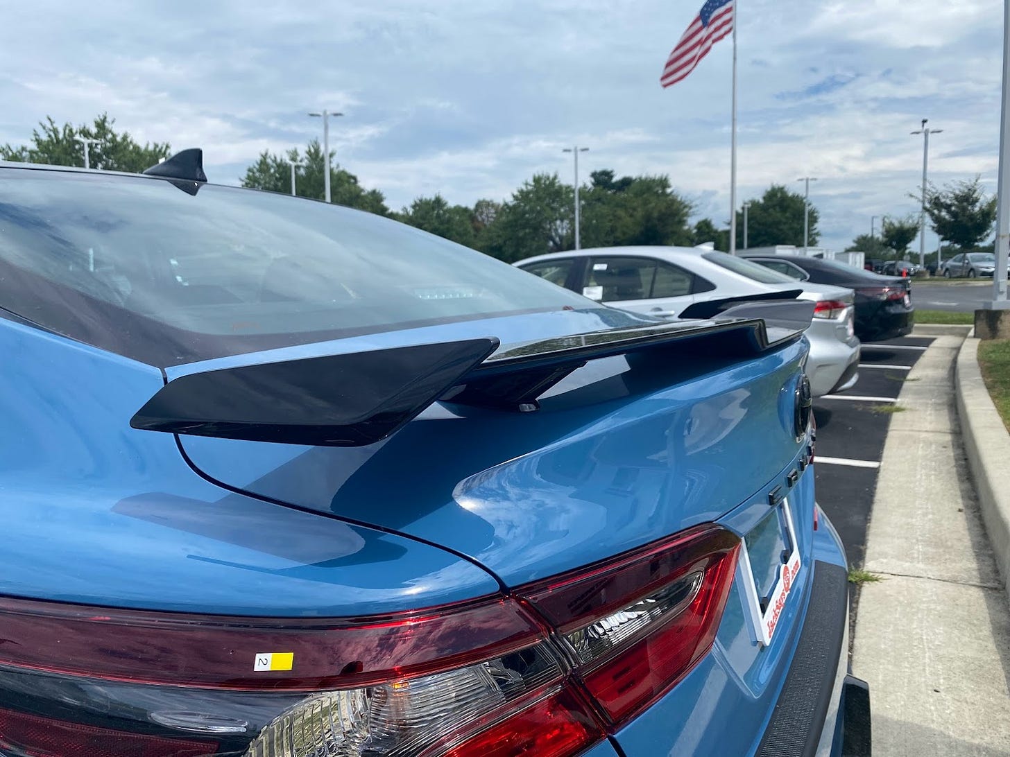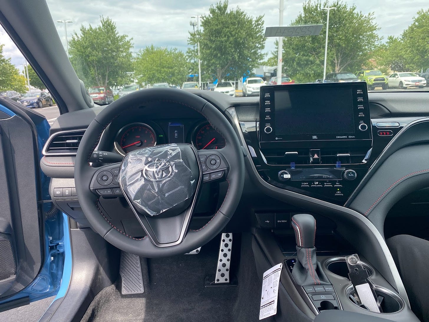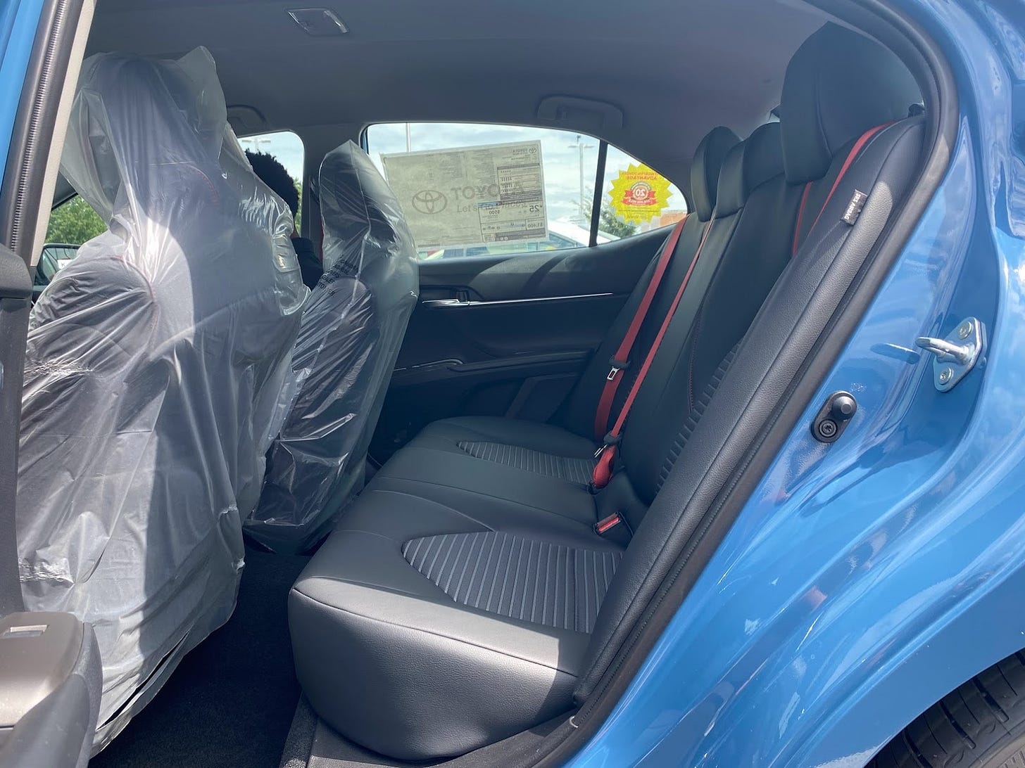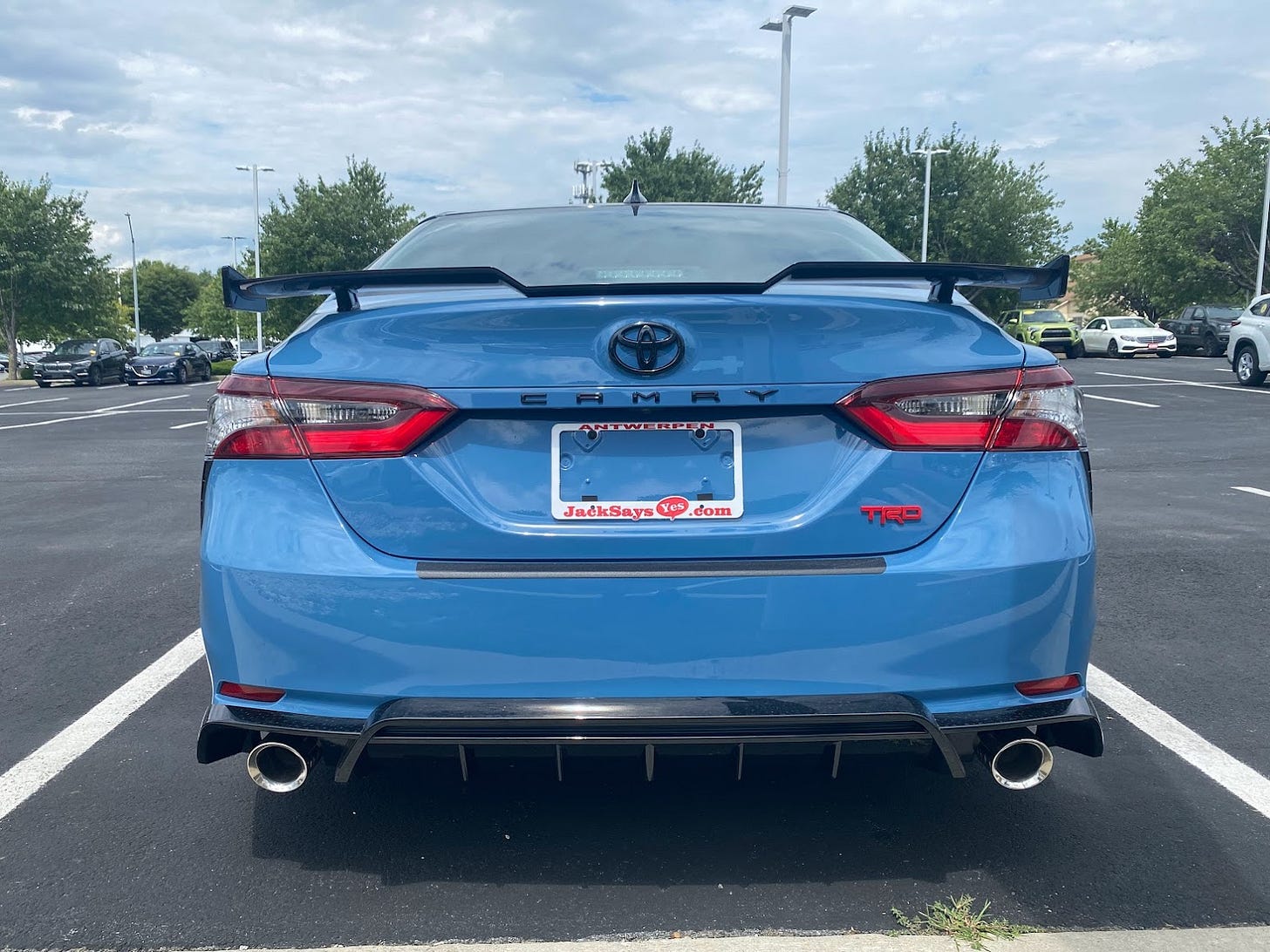 Let’s start on the outside. The single most obvious part of the TRD Camry is the gloss black rear spoiler. While it looks large in pictures, in reality, it’s no larger than that of an Elantra R. Accompanying the black spoiler are a set of black TRD rims, black round body trim including a front and rear splitter as well as side skirts, and a black roof that is part of the two-tone paint scheme on every TRD Camry. This particular model comes in Cavalry Blue, which again, looks suspiciously similar to the Hyundai N blue. Regardless, it still looks great even with the red accents that appear on various spots around the car. In short, it looks like a Camry went through a Forza Horizon 5 upgrade bin. I love it. There is no need for the TRD to look like this, and yet I couldn’t be happier that it does.