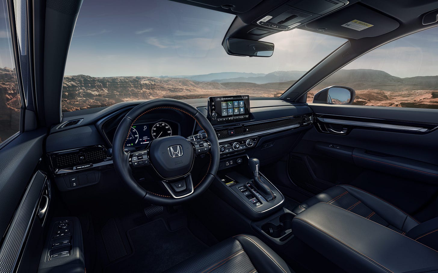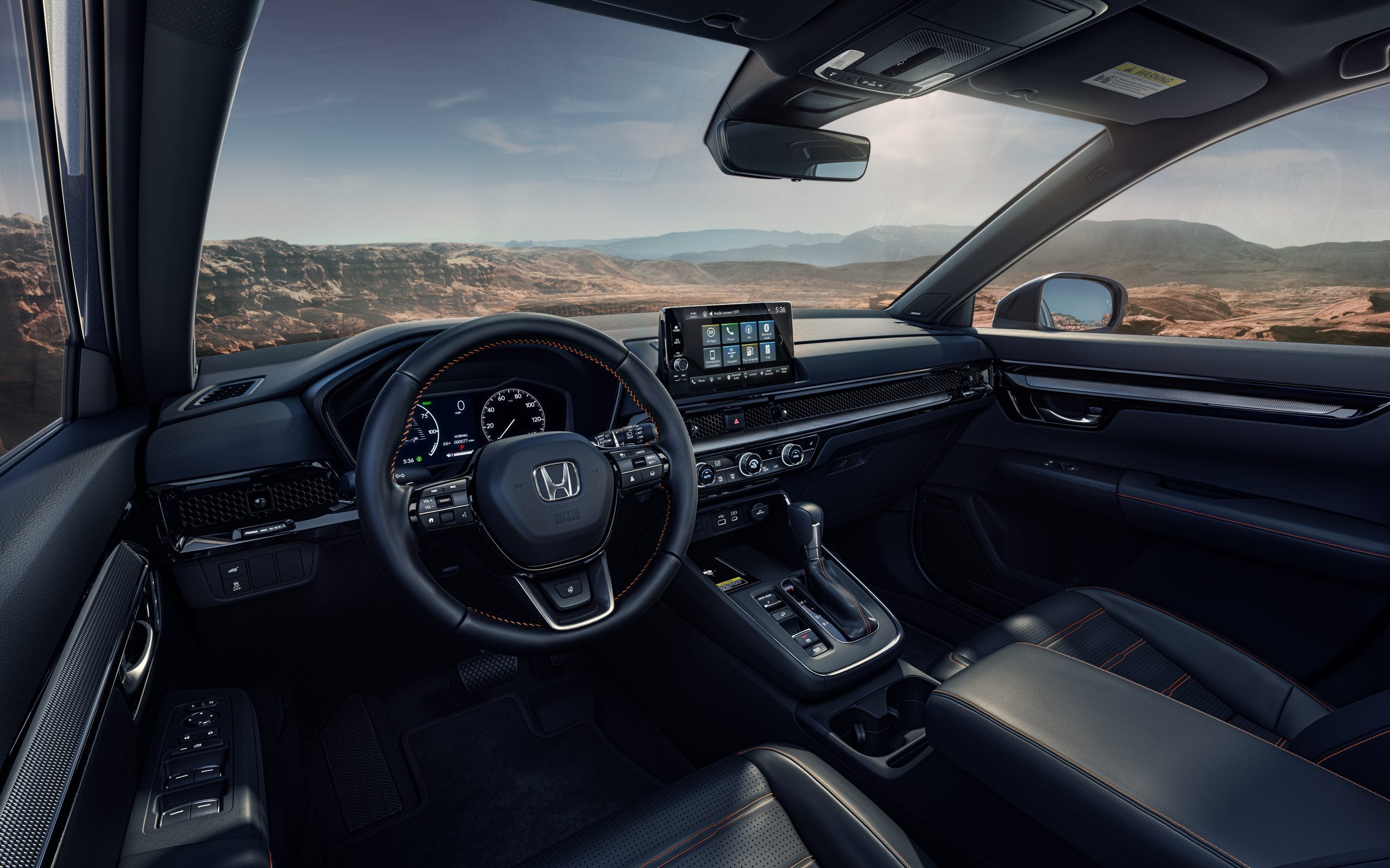 The CR-V borrows from much of the interior design DNA from the HR-V and Civic, as a honeycomb-pattern trim stretches across the dash. Knobs for the HVAC on a simple, clean dashboard, with a standard 7.0-inch touchscreen infotainment system (9.0-inches on the EX-L and Sport Touring). Blind-spot monitoring is standard alongside hill-descent control and driving modes include Normal, Eco, and for the Sport trims a Sport mode.