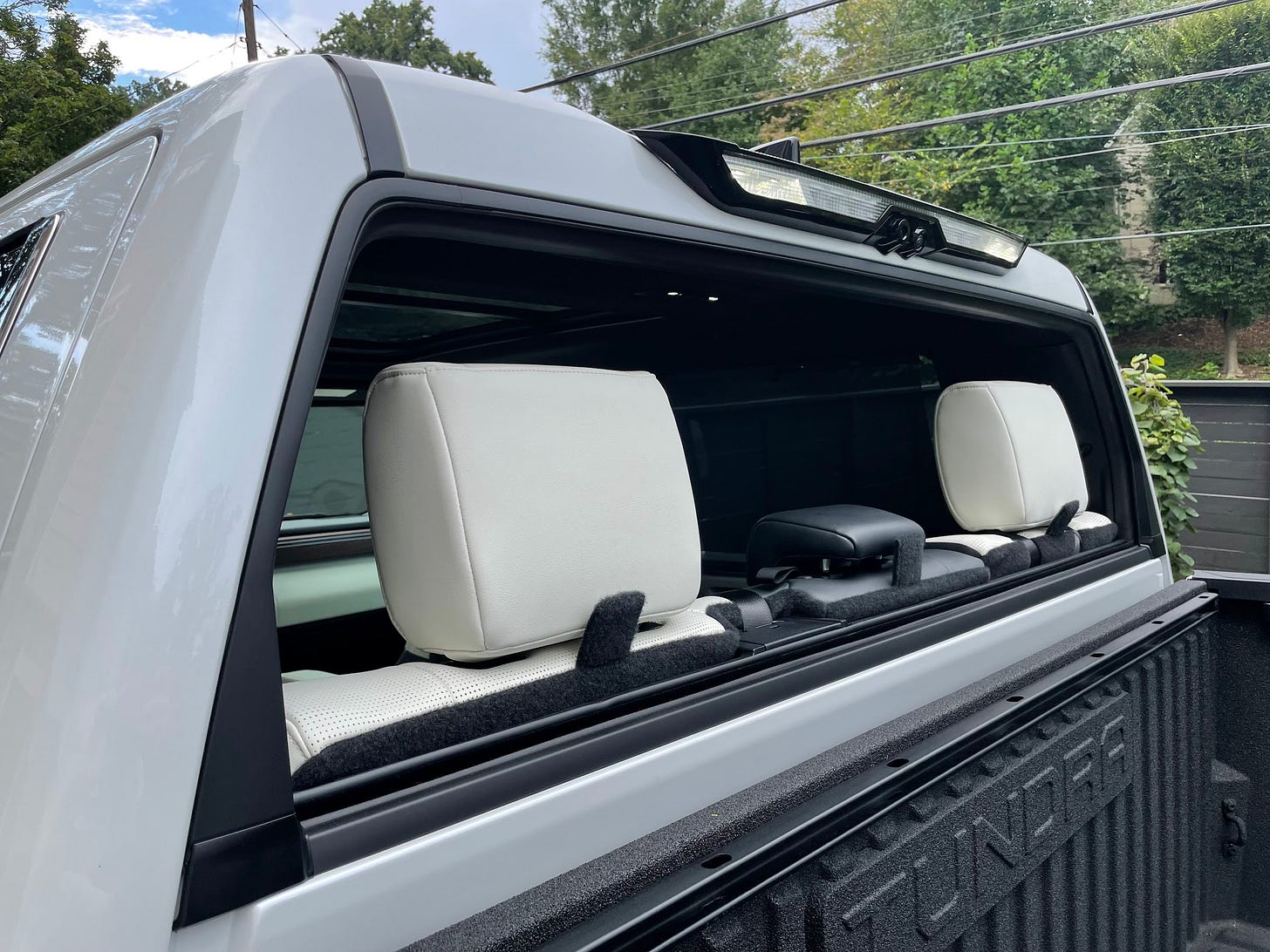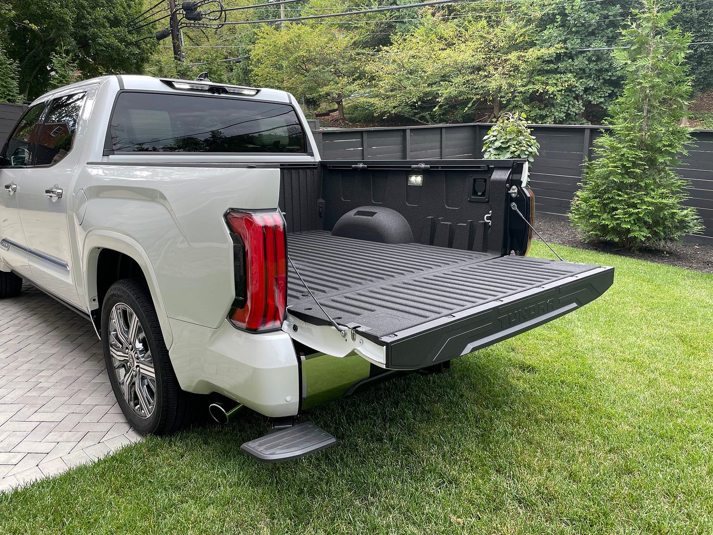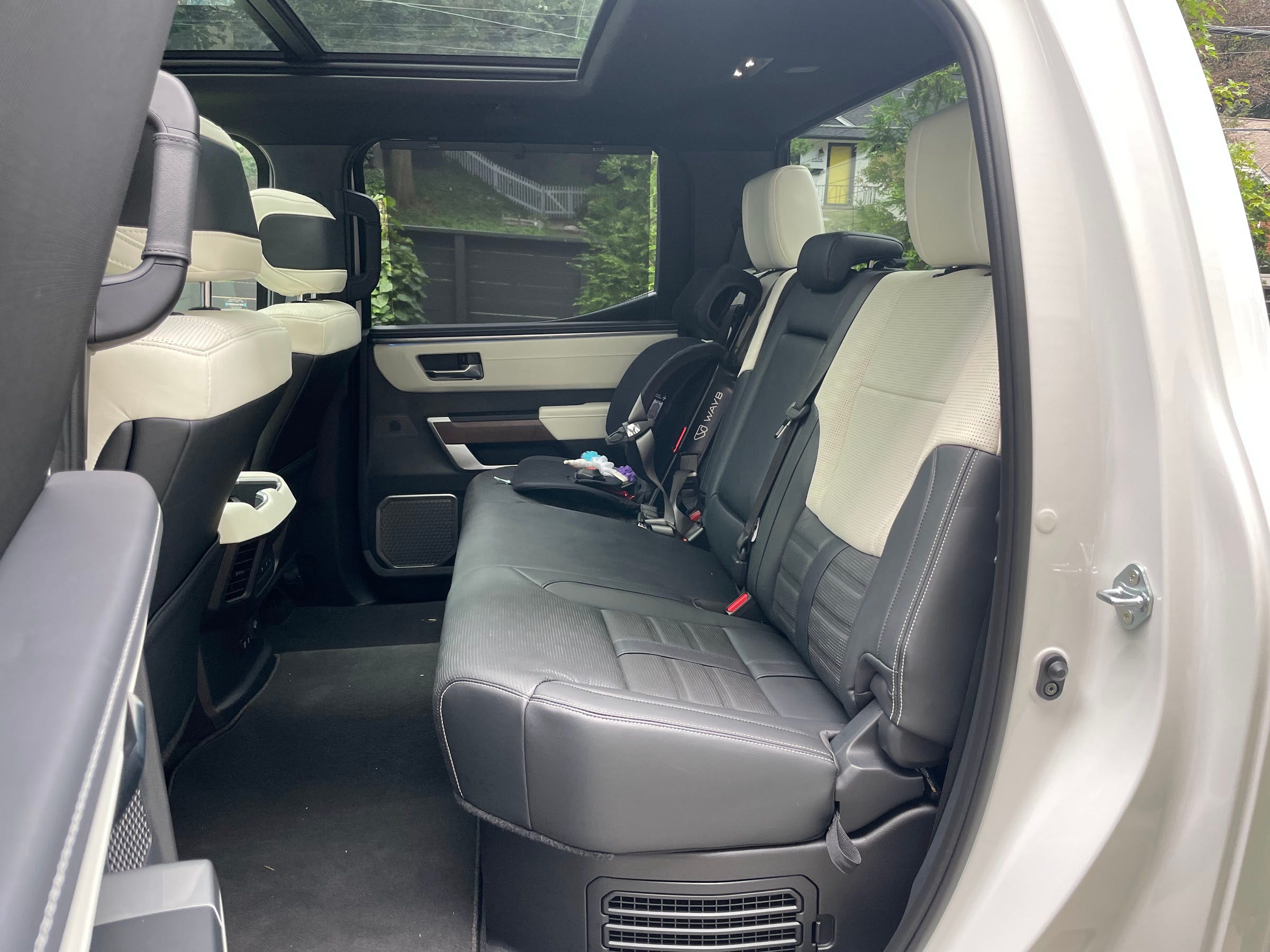 Toyota did seem to spend a good chunk of development budget on the interior at least. Thank goodness the CrewMax retains its signature power down full rear window (another thing the Sequoia wasn’t able to keep alive). The Capstone delights with an available two-tone black and white interior scheme, but the white on the armrests are just asking to look dirty super quick. Luxury abounds with heated and ventilated seats front AND rear and truly soft leather. The dark American walnut wood is a nice touch, but could be used a bit more liberally. Some interior materials could still use an upgrade, especially given the $77,000 price of our tester, there are lots of painted silver plastics, maybe that would be okay for base and mid trims, but would like to see some authentic metal trim and accents at this stratosphere. CrewMax does get a nice huge panoramic roof now. Just missing the massage seats as in the new GMC Sierra Ultimate Denali.