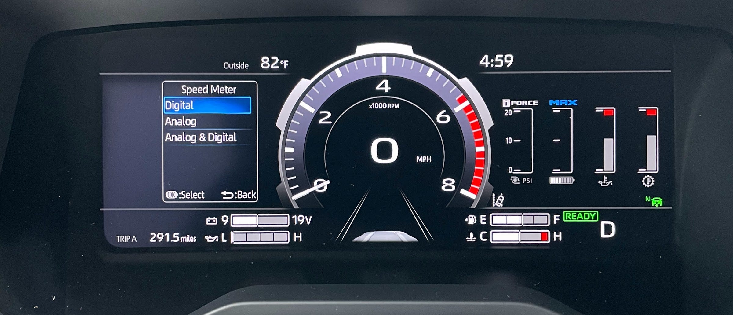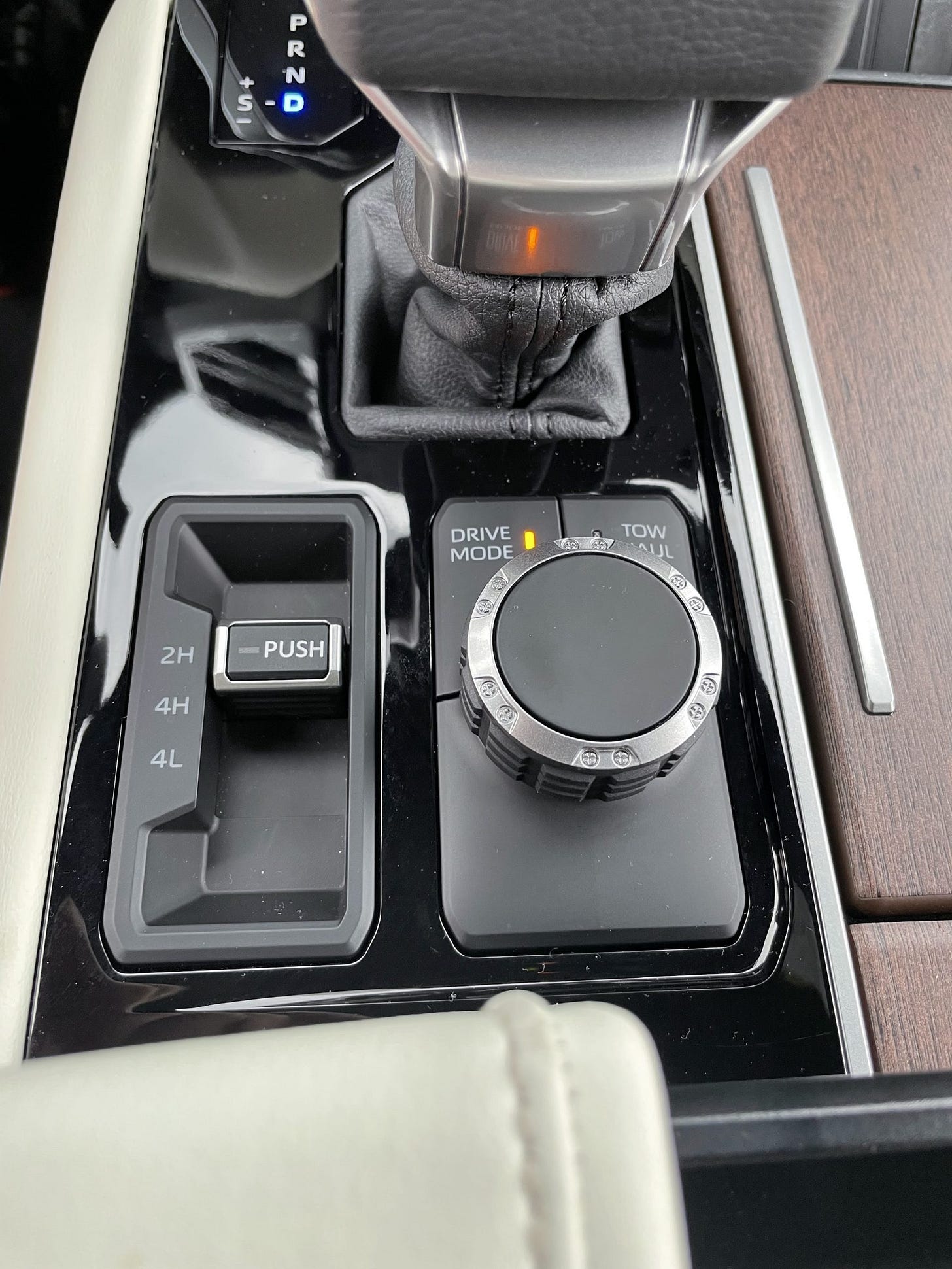 Tech is fairly comprehensive. There are good Advanced Driver Assistance Systems, a big digital cluster (but it’s not super configurable/customizable), big infotainment with wireless phone connectivity, and a digital rearview mirror. Controls largely retain nice physical controls and toggles, although some of the buttons are too similar and small, but with time I am sure you’d get familiar with them. Toyota also tried to mount the wireless phone charger a bit upright, nice for visibility, but I found that my phone would bounce around given some of the truck ride quality and often end up not aligned to keep charging, they would do well to have some sort of tension clip to help keep the phone in place.