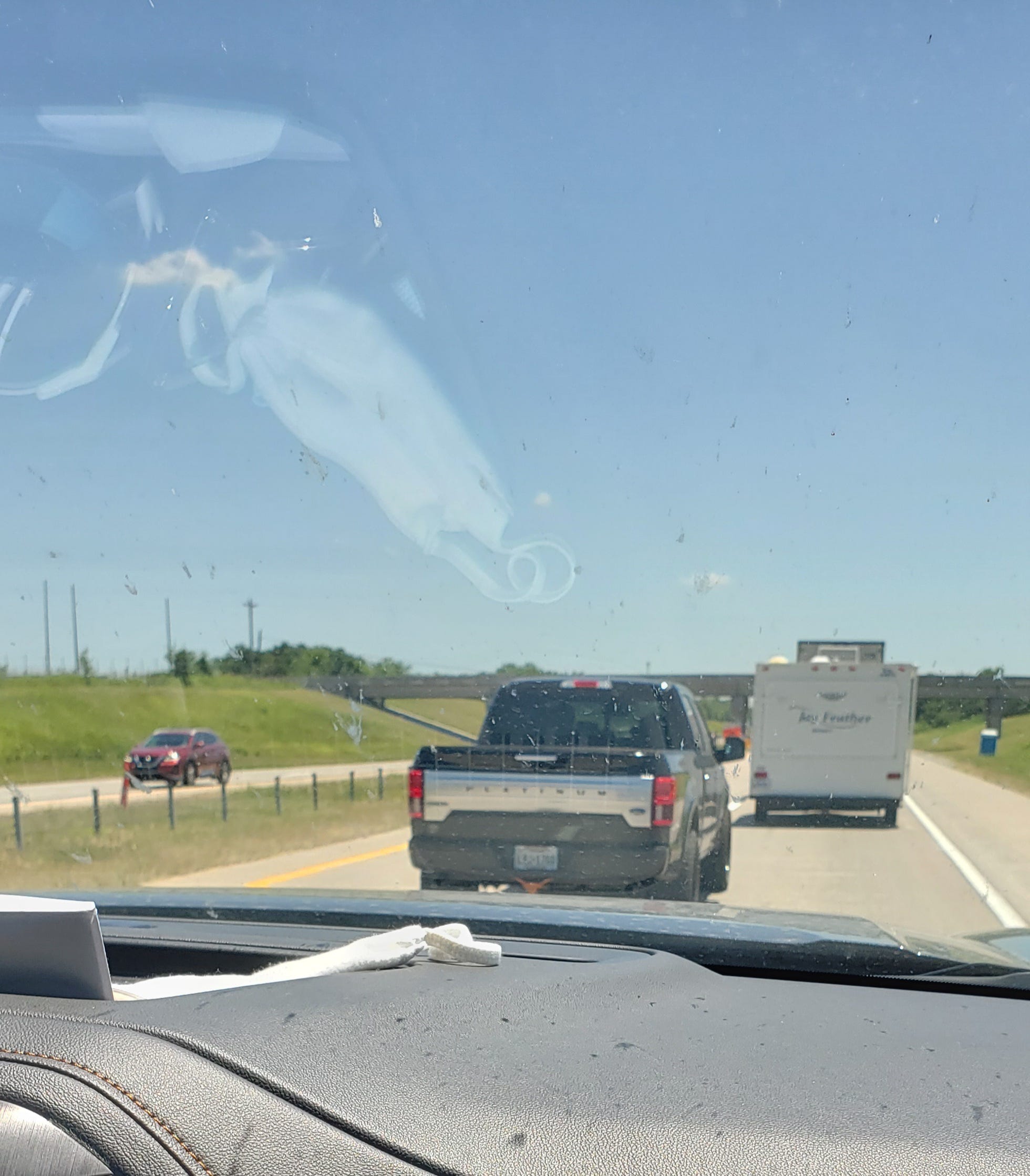 <rant>On an interstate highway with signs that instruct slower vehicles to stay in the right-hand lane *and* explicitly admonish drivers against impeding traffic, this person has been straddling the lane divider for more than a mile before a merge in a construction area, like some misguided Karen on wheels. This "Fuck you, I'm first!" attitude is just childish. Driving is not a contest or game. If you can't control your emotions on the road any better than this person, hand your keys to someone who can. </rant>