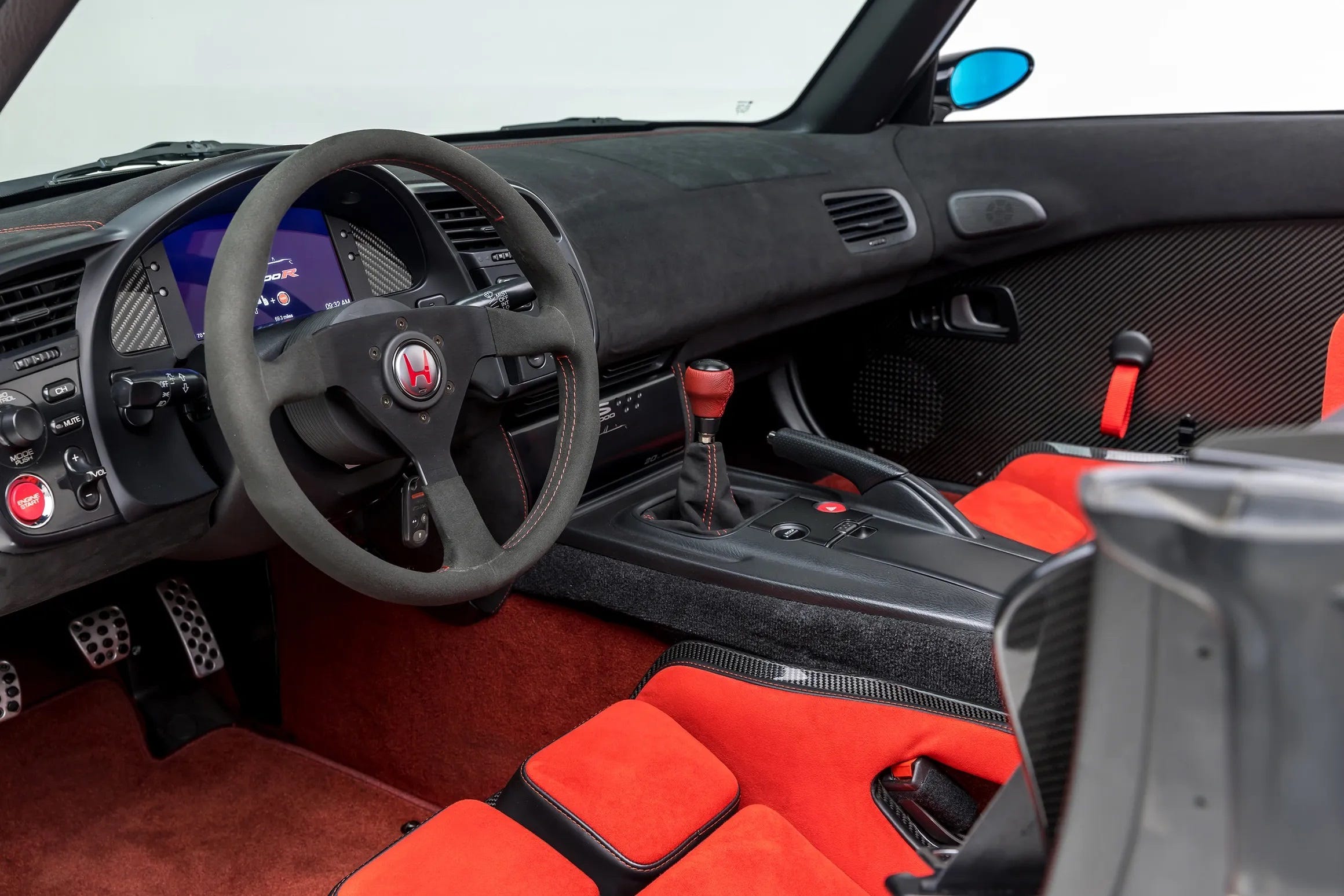 Motivating the S2000R is the last-gen FK8 Civic Type R’s K20C 2.0-liter turbo-four, modified to be longitudinally mounted for a rear-drive platform and enhanced with a Mugen intake, titanium Origin Fab exhaust, and a new intake manifold. In addition, a larger radiator and a new oil cooler have been fitted, and the transmission is the same S2000 gearbox mated to the Civic engine via a modified bell housing. Power ratings haven’t yet been disclosed, but it’s fair to assume it’ll be a healthy step up from the Civic Type R’s 306 horsepower and a far cry from the AP2 S2000’s 240. Such power will be routed to an OS Giken limited-slip diff.