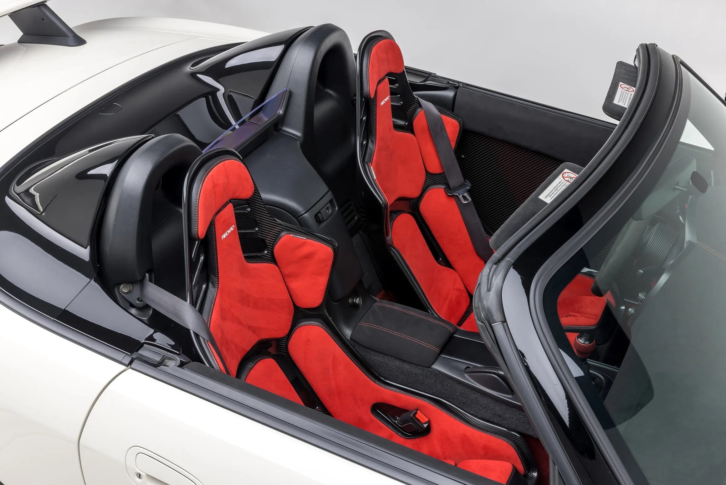 Inside lies plenty of track rat novelties to remind you this is no ordinary S2K. Door cards are carbon, as are the ultra-thin, fixed-back Recaro buckets that look straight out of a McLaren Senna. The seat paddings are red, as is the fabric on the shift knob, and the Motec digital dash features an amazing caricature of the modern Civic’s gauge layout.