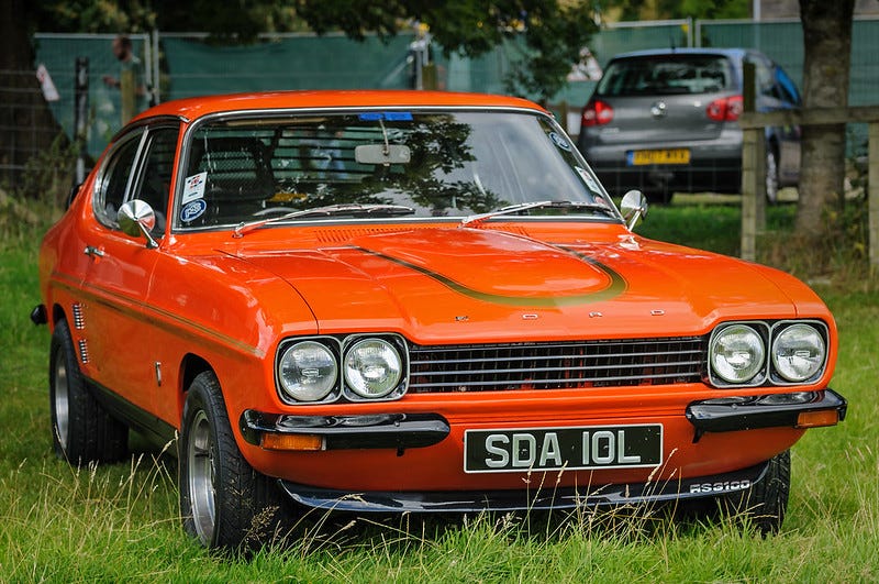 The Capri was the first and arguably best attempt at this. The Capri used the same formula as the mustang, taking the base of the uber-popular Ford Cortina and sticking a fastback Bodystyle on it. Instead of the firebreathing V8, there was a choice of engines, the top of which was the 3.0l and 3.1l Essex V6s. After the Probe failed to replace the Mustang over in the US Ford used it to replace the Capri here. The Probe never really did that well, and neither did its successor, the Cougar which was killed off after just 15,000 units.