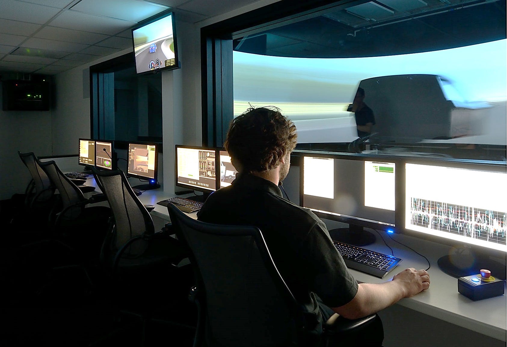 In a remote building on GM's Proving Grounds in Milford, Michigan is a laboratory like you'd see in the movies. A room divided in two by glass. On one end, a two-row computer screen-cladded control center manned by just a handful of engineers, and on the other, an automotive simulator.