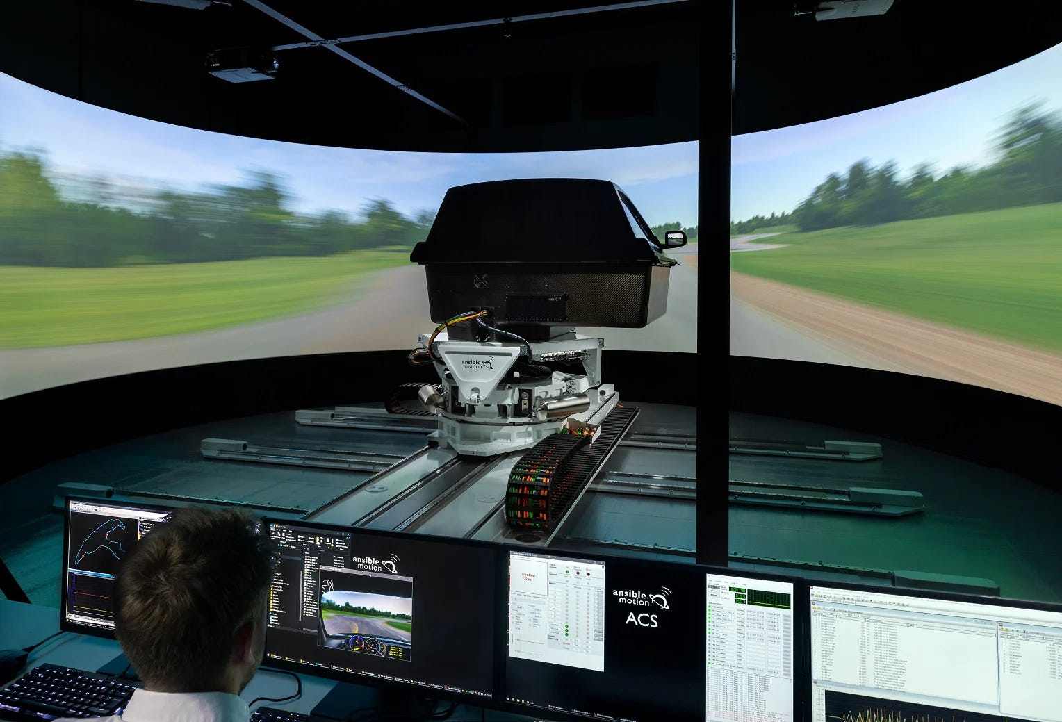 The driver-in-the-loop simulator, originally purchased six years ago for the development of Chevrolet's Corvette, sits on a moving platform around five feet off the ground and is fitted with two seats, a steering wheel, a throttle and a brake.