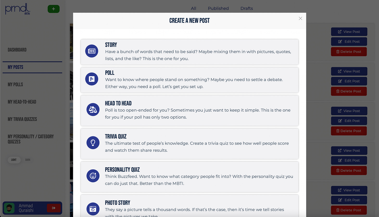 You might remember the green "+" button at the top of the menu on the left. That's the Create New button. Clicking on it will bring up a pop up that lets you select between different post types to create your content. Choose which type of post you want to make and you'll be brought to the appropriate post building tool.