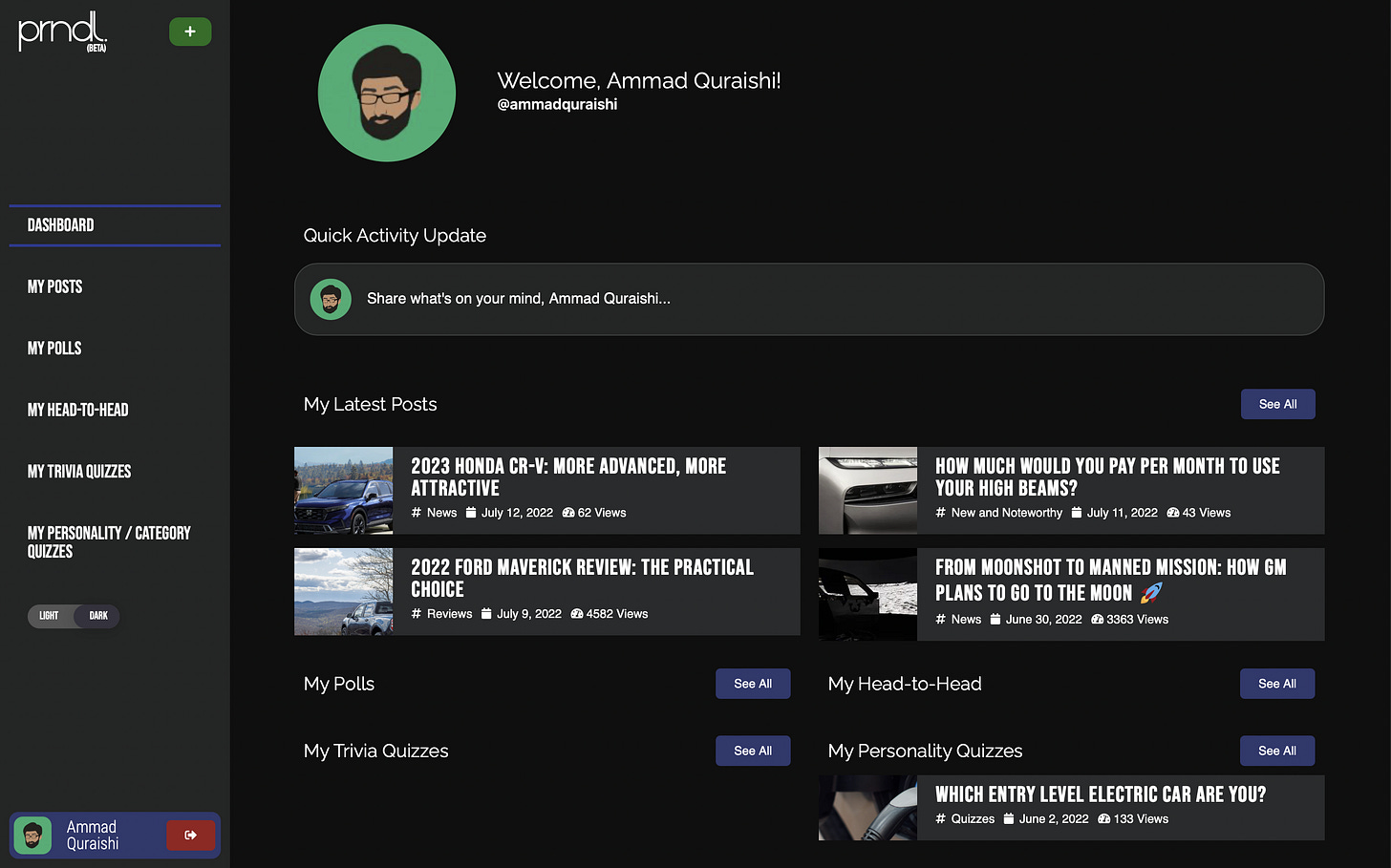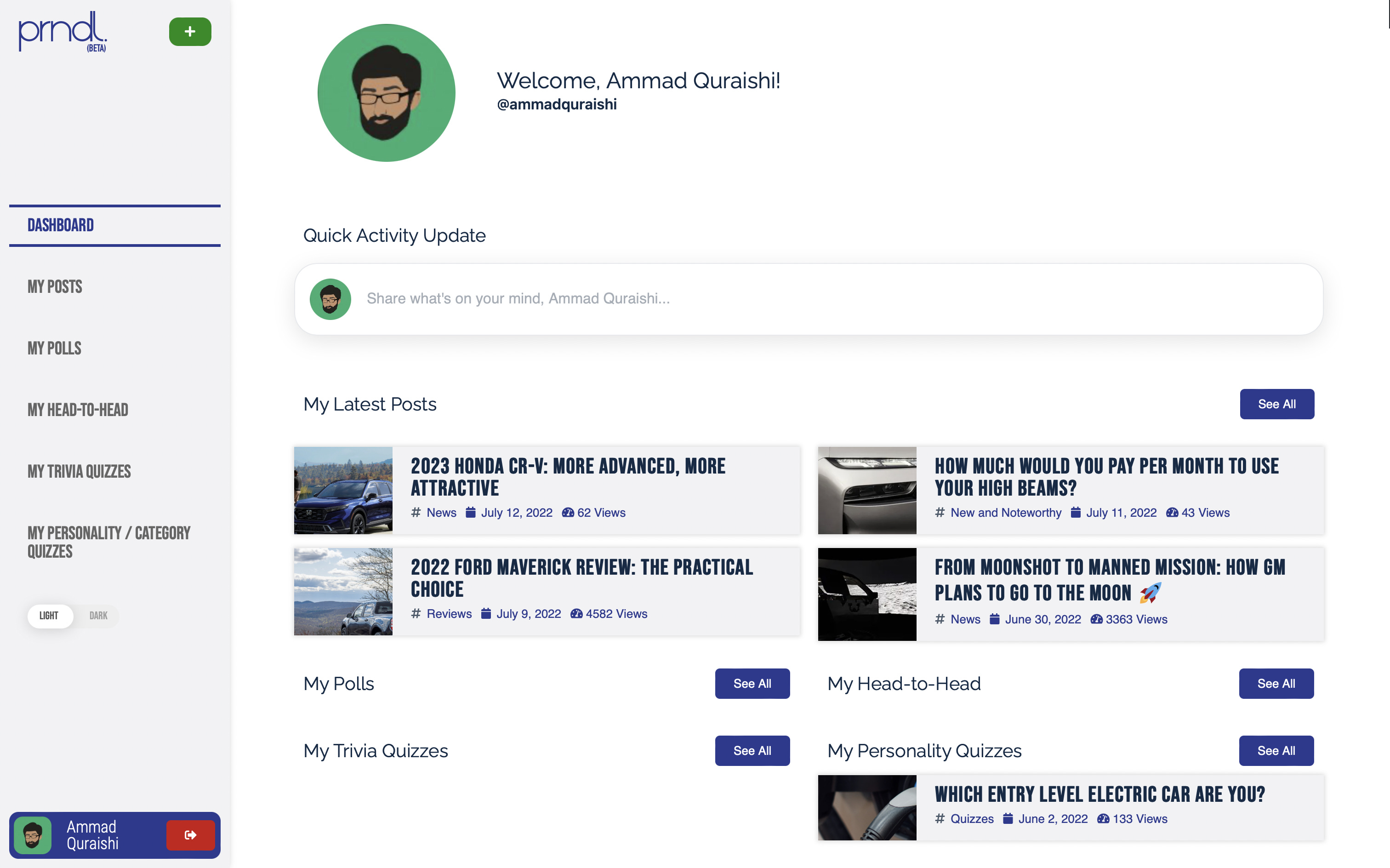On the left side panel, you'll see the Site Logo (which will take you to the PRNDL homepage), a green + button (more on that in a bit), a vertical menu linking you to your different portfolios, along with a toggle to switch between light and dark mode.